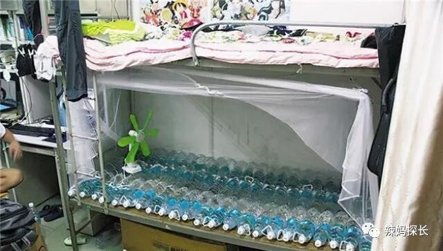 夏天没有空调,有的学生就在自己的床上铺满了冰镇的矿泉水瓶,这样就像是躺在冰床上一样,看着就凉爽。