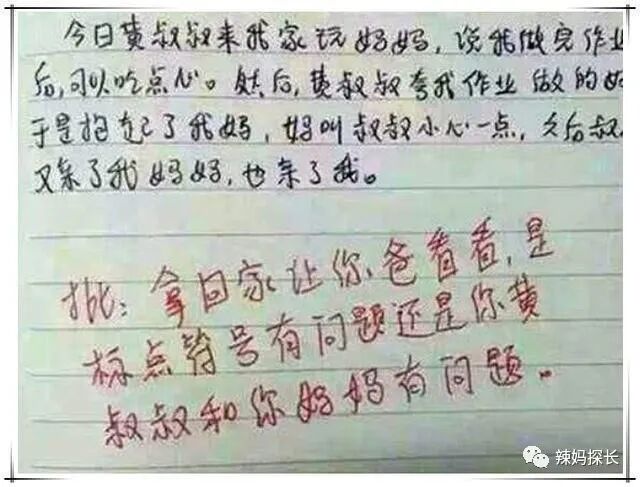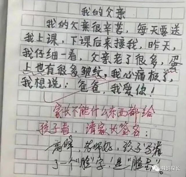 老师在看到了这句话之后,也是给出了评论:家长不能什么东西都给孩子看!老师的这番评论可谓是一语双关,孩子的爸爸在看到了老师给出的批注之后,特意将自家孩子写的这篇作文晒到了网上,并且还表示以后都没脸接娃了。