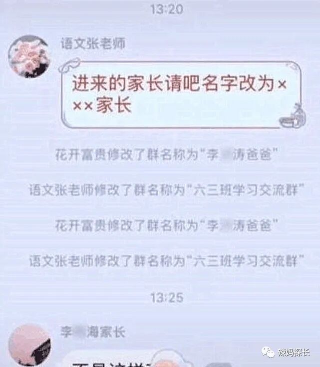 细看了一下朋友发的截图,原来是因为她老公在班级群改名上犯了错误,事情的始因是老师刚组建新的班级群,让各位家长把自己的备注改为“XX家长”,这样的话就更加方便大家沟通。