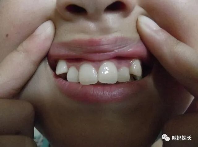 ▼再者说,孩子在吸吮手指的时候,拇指很容易勾住下牙前部,将上颌前拉,很容易长成地包天,影响美观。