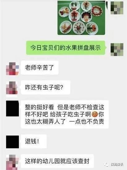 某位家长在看孩子们做水果拼盘的照片时,发现一个孩子的水果拼盘上居然还有一条小虫子,这可都是要给孩子吃的水果,上面居然还有小虫子,家长一看这情况纷纷扬言要报警。