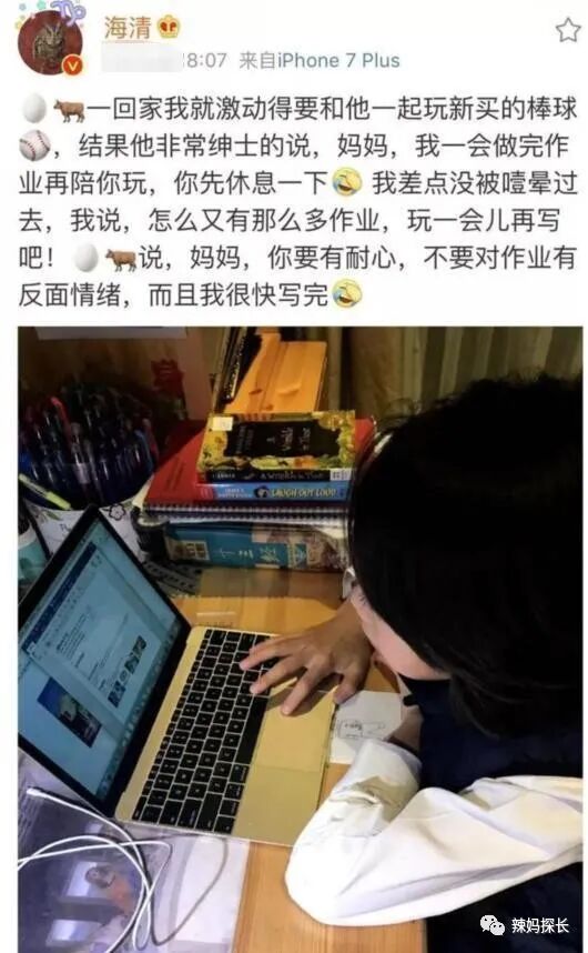有天海清特意发文“吐槽”了一下自家孩子,说自己一回家想和孩子一块儿玩新买的棒球,结果孩子却非常绅士的拒绝了自己的请求,说是有作业要写,等写完作业之后再陪妈妈一块玩。当时海清则让孩子先玩一会儿再写作业,结果儿子却回答:“妈妈,你要有耐心,不要对作业有反面情绪,而且我很快就可以写完!”