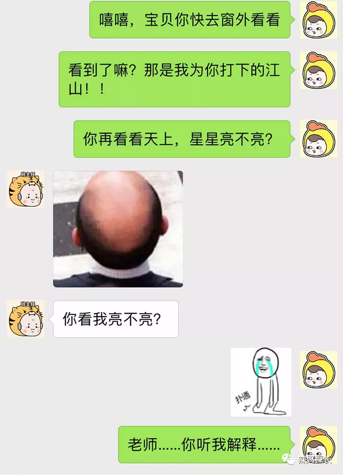 老师直接发来了自己的秃顶照片,还刻意调侃:你是为我打下的江山吗?你看看这天上的星星亮不亮?