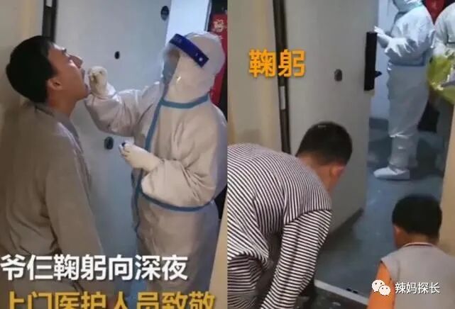 在工作人员上门给家里人做完了核酸检测之后,这一家人集体向医护人员致敬,孩子更是学习父亲的样子,鞠躬成90度。