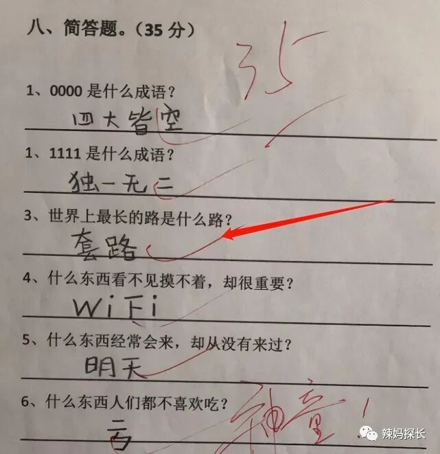 到了第3道题,有些网友就觉得比较迷惑了,老师的这道题目是:世界上最长的路是什么路?结果孩子回答了两个字:套路,获得了满分。