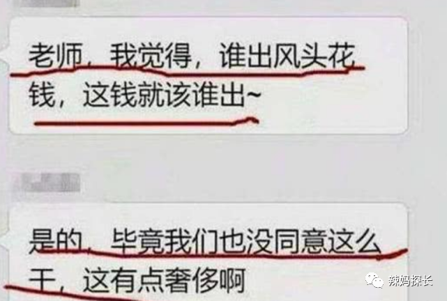朋友实在是气不过,于是便在群里发了一句:谁出风头谁就出这个钱!没想到有好几位家长都通通附和表示同意。而那些一开始在群里非常积极的家长,却都通通不说话了。