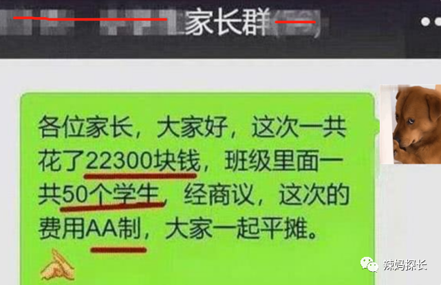 老师将这2万元的明细发到了群里,并且建议各位家长AA制,对于这位老师的做法,朋友觉得很不满意。因为当时活动内容都是一些爱出风头的家长在群里起哄,老师也都默许了,并未经过所有家长的同意。