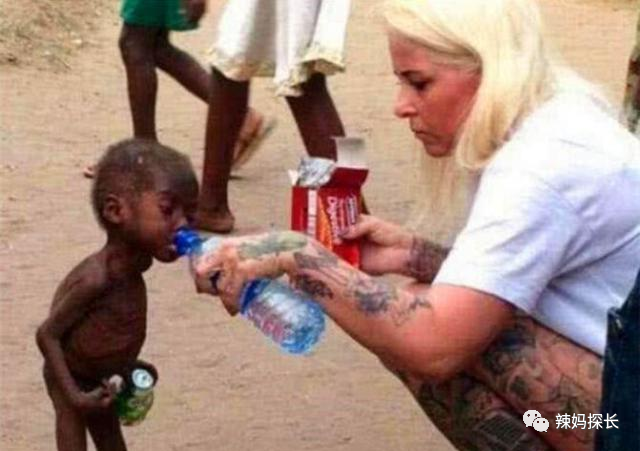 事情的经过是这样的,当时有一位外国女游客和志愿者看到路边有一个已经枯瘦嶙峋的男孩,她便拿出一瓶水俯下身子喂给孩子喝。
