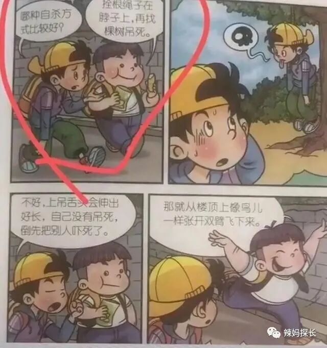 在这本绘本当中,不仅是讲到了“自杀”这个问题,而且还说到了“上吊”以及“跳楼”等这种极端的行为。一位家长认为关于这种负面消极的话题就不应该存在,会误导孩子,因此作者也是第一时间就做出了道歉。