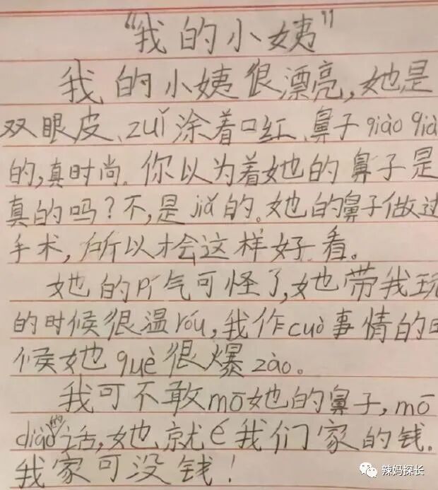 孩子在后面还写道:小姨的脾气可怪了,她平时很温柔,但是这个小学生做错事情的时候她却很暴躁。平时他也不敢摸小姨的鼻子,因为摸她的鼻子的话,她就会讹他们家人的钱,怕鼻子被摸坏了。