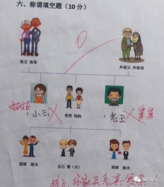 试题上是希望学生能够认清楚家里的亲戚关系,因此特意留了两个括号,让孩子把家里的重要亲切人物给写上去。结果没想到这孩子居然在括号里填上了小三和老王,这看的老师都是一愣一愣的。