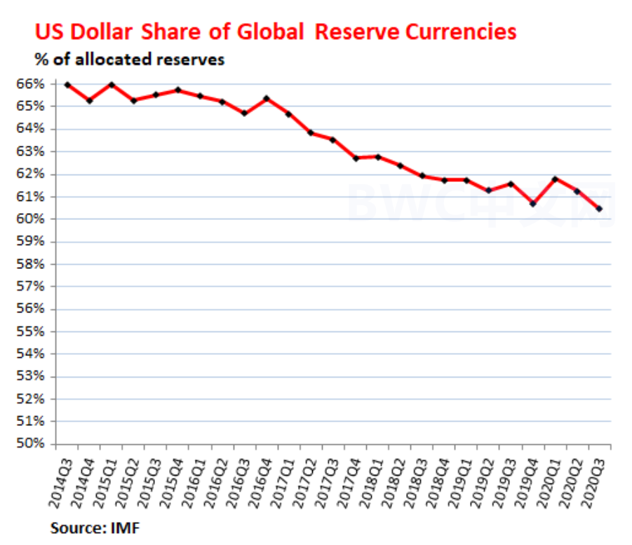 根据国际货币基金组织(IMF)的最新数据,2020年第三季度,全球央行(美联储除外)持有的以美元计价的外汇储备的全球份额(美国国债,美国公司债券,美国抵押贷款支持证券等)下降至60.5%。这是自1995年以来的最低水平。在过去的六年中,美元所占的份额以每年约1个百分点的速度下降: