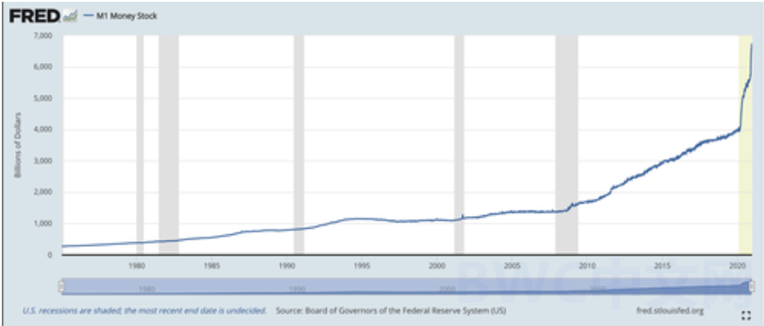 按照过去六年的下跌速度,美元的份额下降到50%可能需要十年时间,不过,可能这个时间会照此提前,因为仅2020年一年间,美联储就开启了空前的美元印钞机模式,已超过以往任何一个时期。如下图:显示了M1的绝对值增长方式。