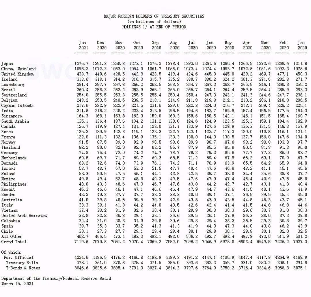 数据显示,自2018年以来,美债的全球主要央行持有者已累计减持至少2万亿美元的美债份额。并且连续多月呈现出净抛售状态。值得一提的是,美财政部TIC最新数据显示,截至今年1月,中国连续第三个月购买了美国国债,中国持有的美国国债规模在1月增加229亿美元,达到1.095万亿美元,创下2019年10月以来最高水平。1月份的229亿美元是自2017年8月以来最大的月度购买量。不过,需要注意的是,在截至2020年12月的27个月间,已累计共减持约1758亿美元的美债。