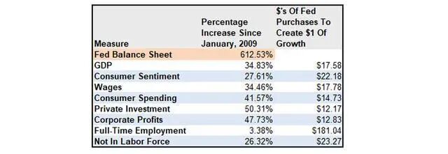 在此期间,美国经济GDP的累计总增长仅为32.9%。简单换算表明,美国每1美元的增长则需要19.86美元的债务,此图显示了美联储资产负债表的扩张及其在经济增长各个方面的有效投资回报率。