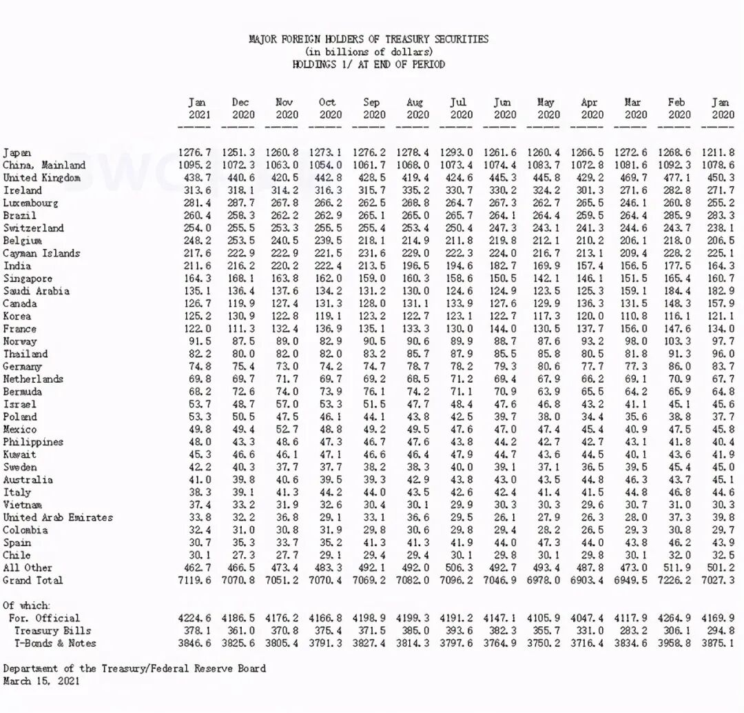 数据显示,自2018年以来,美债的全球主要央行持有者已累计减持至少2万亿美元的美债份额。并且连续多月呈现出净抛售状态。值得一提的是,美财政部TIC最新数据显示,截至今年1月,中国连续第三个月购买了美国国债,中国持有的美国国债规模在1月增加229亿美元,达到1.095万亿美元,创下2019年10月以来最高水平。1月份的229亿美元是自2017年8月以来最大的月度购买量。不过,需要注意的是,在截至2020年12月的27个月间,已累计共减持约1758亿美元的美债。