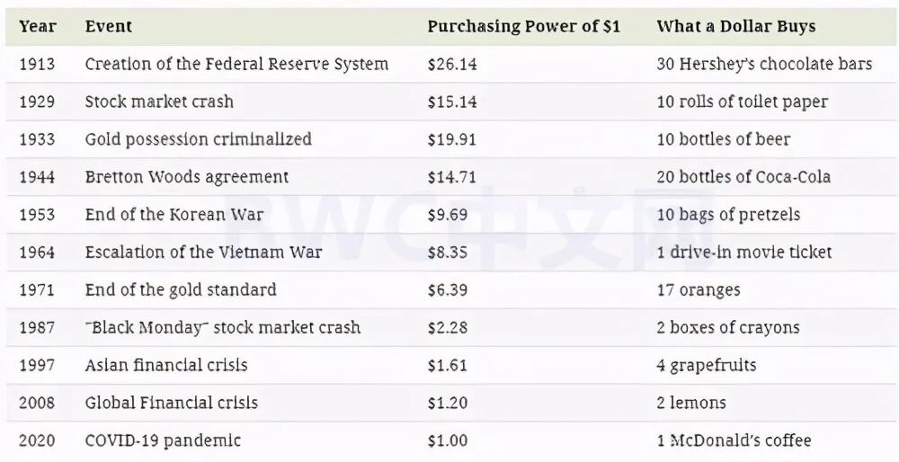 例如,1913年,美联储法案授予美联储银行管理货币供应量的能力,以确保经济稳定。那时,一美元可以购买 30 颗Hershey的巧克力棒。随着更多美元的流通,商品和服务的平均价格上升,而 美元的 购买力下降。到1929年,消费者物价指数(CPI)的价值比1913年增长了73%,但现在1美元仅够购买10卷厕纸。