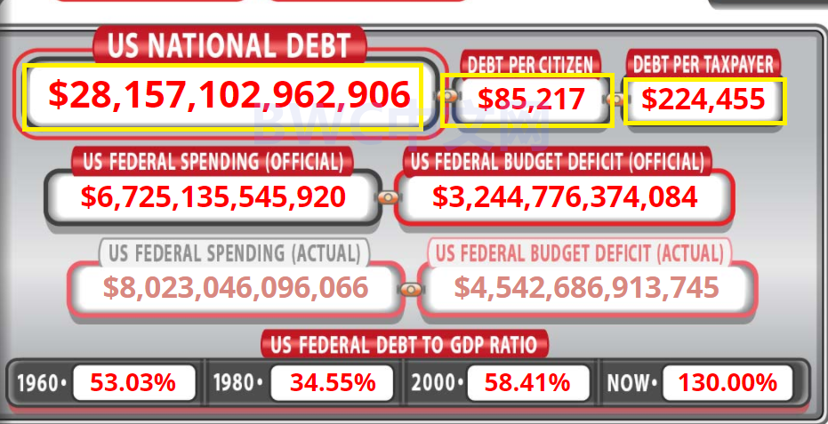 事情的一个新进展是,截至4月11日,美国联邦债务总额已高达28.16万亿美元,如下图,相当于每个美国公民(男人,女人,孩子)被迫为此背负85,217美元债务,每个美国纳税人为此背负224,455美元债务。美国金融专家约翰•怀特海(John W. Whitehead)日前表示,这是美国经济的金融暴政。