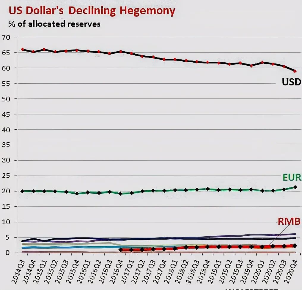 IMF在4月公布的全球国际储备数据已经在显示这个趋势,截止2020年末,美元在各国外储中的份额在2020年第四季度意外下降至25年来最低,占比连续三个季度下降至59%,而2000年时该比例还高达73%,如果按照这个趋势,我们很快会看到这个数字接近50%。