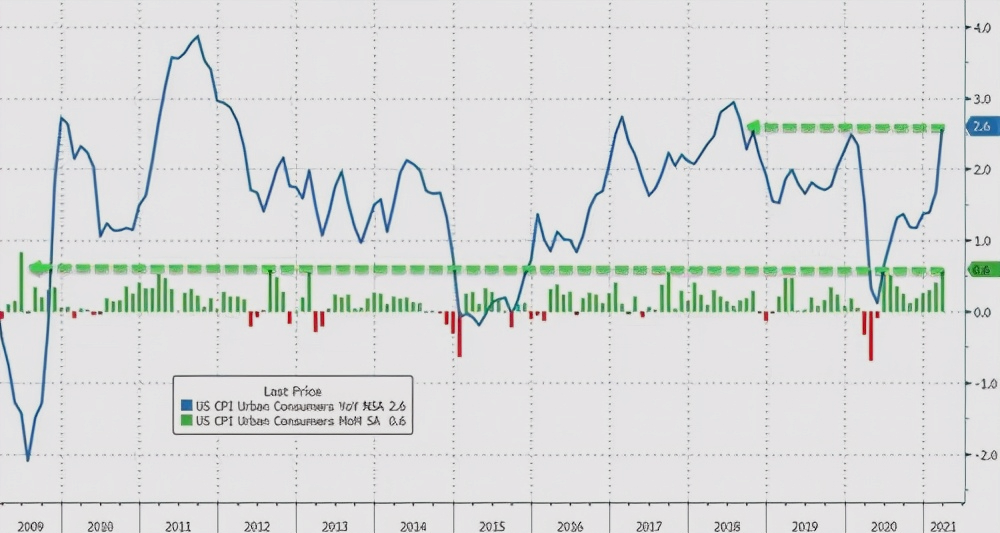 根据美国劳工统计局在4月13日公布的数据,3月通胀数据CPI同比增长2.6%,创下2018年8月以来的最高水平,超过预期与前值,其中,推动CPI增长的最大推手是原油和天然气价格的上涨,涨幅达13.2%。