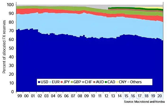 这也意味着,现在无底线的货币宽松和名义负利率将促使美元流动性由旱转涝,并影响美元地位,促发全球市场寻找美元的替代方案,据IMF在4月数据,美元在各国外储中的份额在2020年第四季意外下降至25来以来的最低,占比大幅降至59%,而2000年时该比例还高达73%(具体请参考下面这张美元在世界货币储备中的份额逐渐缓慢下降的趋势图表),同样,出乎市场意外的是,自2008年以来,新兴市场和欧洲国家的同行却正以50多年来未曾见过的速度在抛美债而置换黄金。