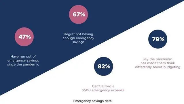 对于那些削减开支的人,有64%的人表示他们减少了外出就餐或外卖的支出,61%的人减少了在音乐会或电影等娱乐上的支出,而55%的人减少了服装购买,52%的人减少了旅行支出。整个调查中最令人震惊的数字:高达82%的受访者表示,如果不借钱,他们将无法支付500美元的紧急开支。作为背景,在大流行之前,调查显示大约有一半的美国人负担不起500美元的紧急开支,这意味着说自己无法承受小规模紧急状况的人数增加了60%。