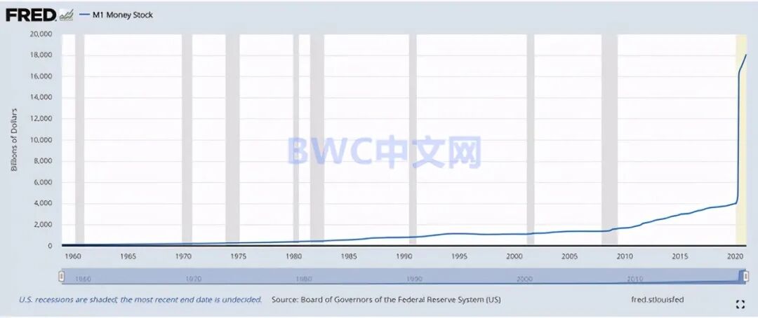 BWC中文网注意到,在过去的40多周中,美国M1货币供应量一直在直线上升。美国M1在2020年增长了68%以上,而自2009年以来至今,美联储已经将其资产负债表扩大了631%。而就在这个时候,事情有了新的变化。