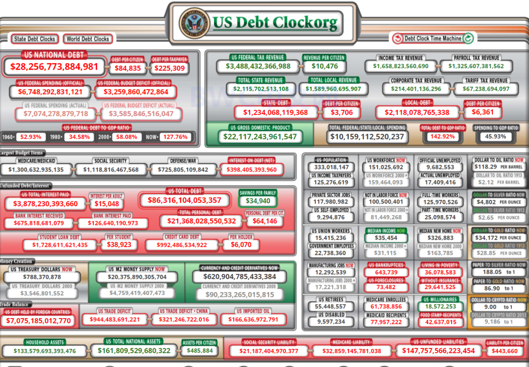 过去数十年间,全球多个发达国家都是依靠债务而发展经济,进而形成了人们提前消费、养尊处优、不劳而获的习惯,一些国家甚至达到了“欠债上瘾”的状态,美国经济就非常明显。截至5月7日,美国联邦债债务总额已高达创纪录的28.3万亿美元,不过,这似乎远远不够。如下密密麻麻如蜘蛛网般的图表,是美国不断变幻的债务时钟,它每分每秒都在提醒美国人,美国经济的一切运转都是由林林总总的债务堆积而来的。