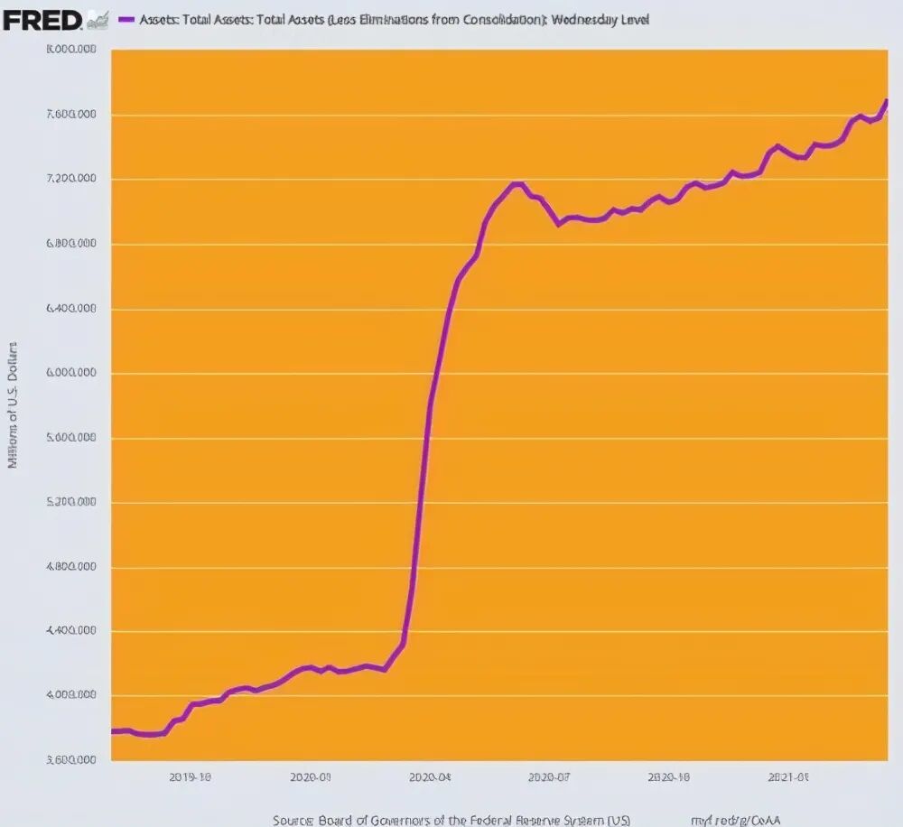 例如,美联储最新公布数据,在过去的40多周中,M2货币供应量一直在直线上升,超过自美联储自1913年成立以来的货币增长速度,自2009年以来至今,美联储已经将其资产负债表扩大了630%,下图中的这根大直线完美的地诠释了这个过程,换句话说,美国正将这些庞大的数万亿美元的债务赤字进行货币化。而目前,美联储的资产负债总额已高达创纪录的近8万亿美元。