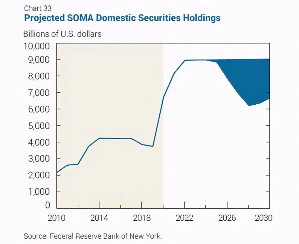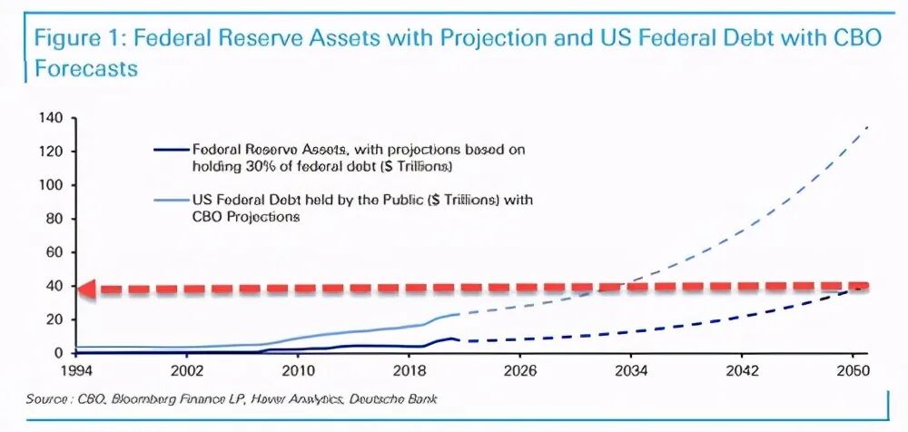 德意志银行信贷策略师吉姆•里德(Jim Reid)分析认为,即使在接下去的某个时间,美联储逐渐减少购债,还远不会达到资产负债表扩张结束的周期。如下图,他向国会预算办公室展示了美国公共债务到2051年的预测路径。里德说,“将需要为债务提供资金,如果美联储资产负债表与债务的比率保持在全球金融危机后的平均值(当前约为30%,而目前约为38%),那么从今天的不到8万亿美元起到2050年,美联储的资产负债表将约为40亿美元。”