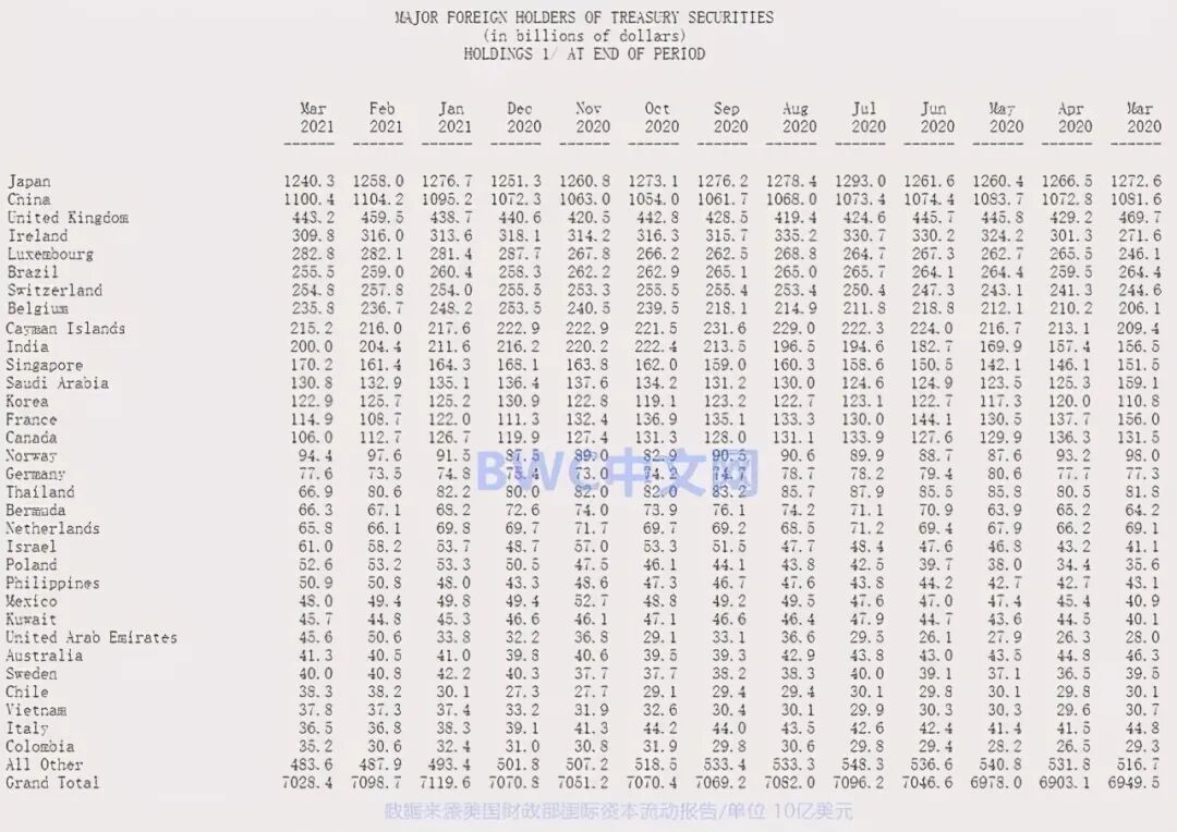 让美债市场感到意外的是,美国经济的多个传统盟友开始大幅抛售美债。例如,日本在3月减少美国国债持有量1.4%至1.24万亿美元,为2020年1月以来最低。而在此之前,日本2月减持了185亿美元美债。并且自去年8月至今年3月的8个月间,除今年1月之外,日本7个月都在连续减持美债。而英国、加拿大、比利时,沙特等至少10个美债的海外持国也出现不同程度的减持。换言之,全球至少10国都在抛售美债。
