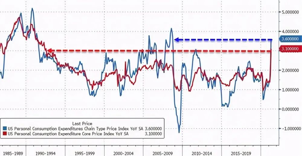 美国商务部经济分析局在5月28日公布的经济数据显示,美国5月个人消费开支通胀指数同比上涨3.6%,创下2008年以来最大涨幅,超出美联储的2%目标。更为让市场意外的是,核心PCE平均指数更是同比飙升3.1%(高于预期的同比增长2.9%),并且是1992年5月以来的最高水准(具体数据请参考下图),而4月CPI已经创下2009年以来最大幅度的上涨至4.2%,且涨幅远超出预期。