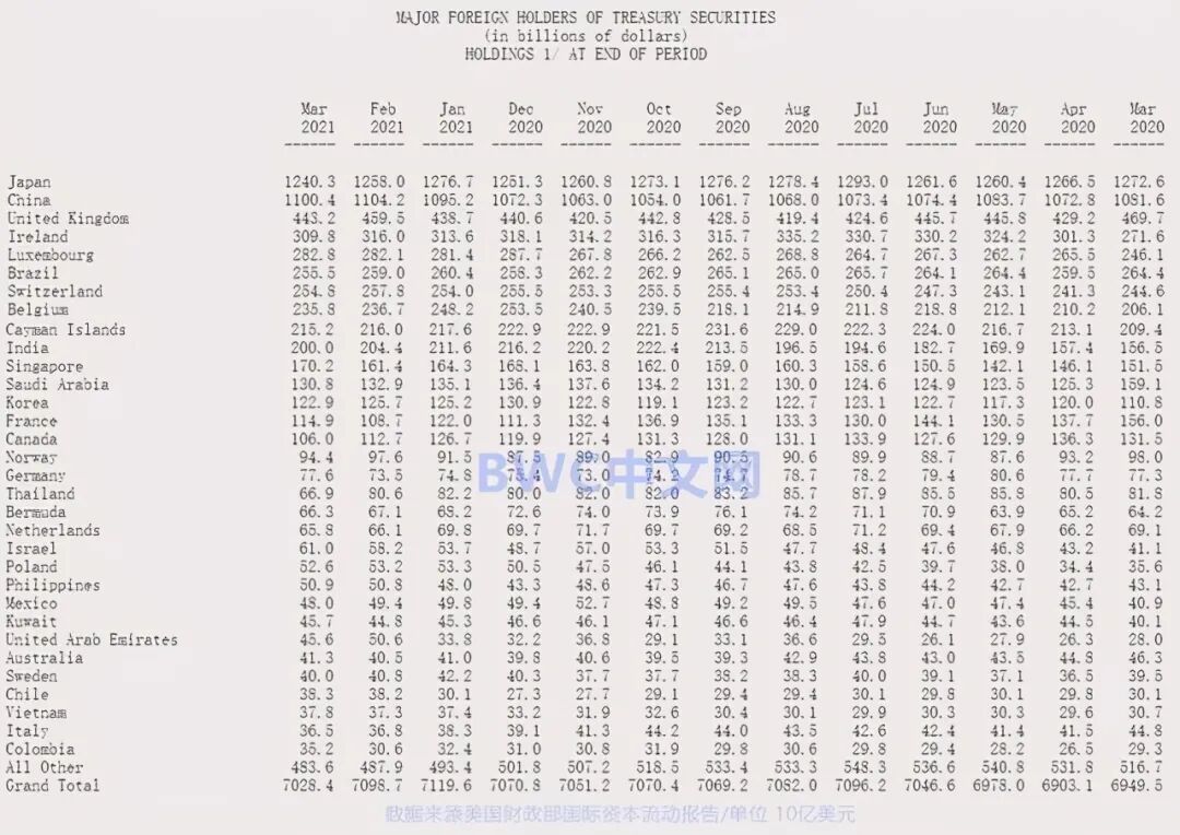 比如,中国在3月份出售了38亿美元的美国国债,使持有的美国国债减少至1.1万亿美元。另外,作为美国经济盟友的日本在3月减少美国国债持有量1.4%至1.24万亿美元,为2020年1月以来最低,英国、加拿大、沙特等10多个美债持有者也出现不同程度的减持。