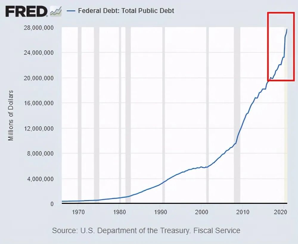 截止6月3日,美国国债时钟上显示的债务已超过28.3万亿大关,且数据还在实时快速增长中,该时钟挂在纽约第44街的一条通道中,债务钟附近有一些著名的地标,例如百老汇,时代广场,该钟以秒为单位递增美国借款的数量,如果你在那里呆上几分钟,那是几百万美元。
