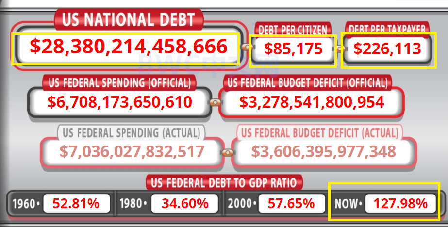而通过下图,我们清晰地看到,在美国联邦28.4万亿美元的债务总额中,每个美国公民(男人,女人和孩子)为此背负的债务为 85,175美元,是有史以来的最高水平。每个美国纳税人的债务也创下了226,113美元的历史新高。美国联邦债务总额与GDP的比率现在达到128%。这意味着,一旦美联储撤出,越来越多的美国人将不堪重负。
