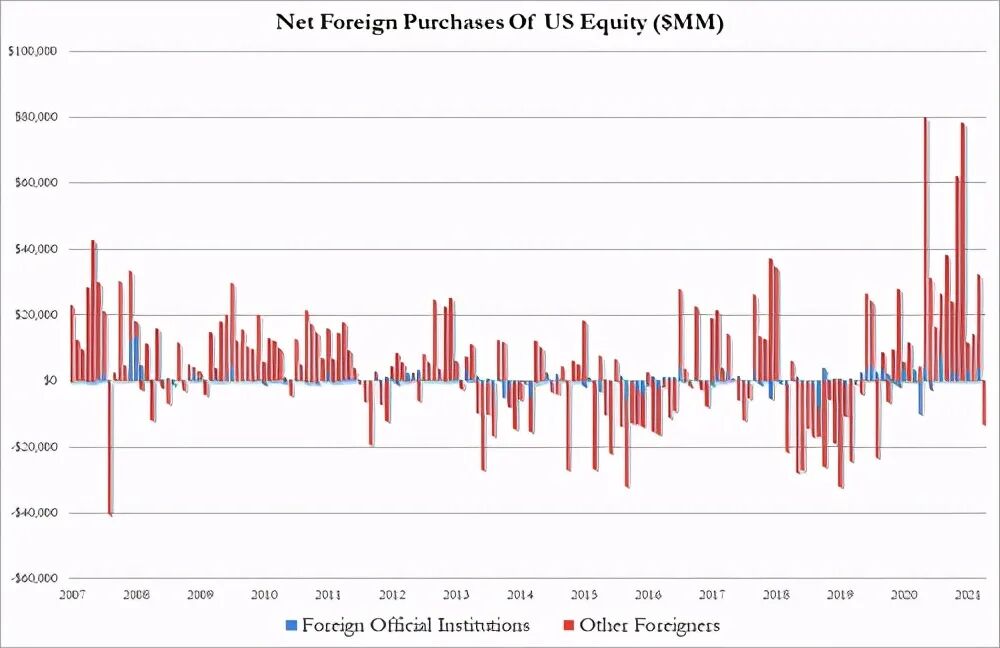 首先来看美国股票,据美国财政部6月16日最新公布的国际资本流动报告显示(该数据延迟两个月惯例),事情的一个显著新变化是,外国买家自 2020 年 4 月以来首次抛售美国股票,这也是自 2019 年8月出现回购危机而非量化宽松以来最大的净抛售。净卖出美国股票规模为133亿美元,这恰恰是在美国市场开启世纪性大印钞一周年,达到美元饱和后,市场的溢出效应,也正是在4月,美国通胀指数风险在增大。而这正是大量资金从美国市场陆续撤出的一个信号及缩影。事情还远没有结束。