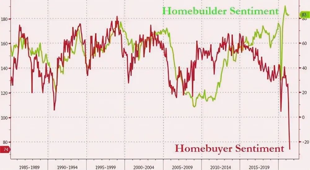 诺贝尔经济学奖得主罗伯特·席勒表示,美国房地产市场可能正在形成泡沫,如下图所示,目前,美国购房者的信心出现崩溃(由于创纪录的房价)和房屋建筑商信心飙升(也由于创纪录的房价)之间出现了创纪录的差异。