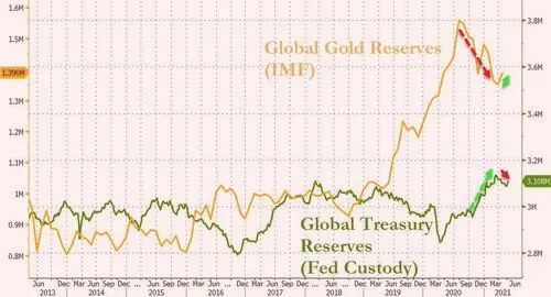 紧接着,《美元大崩溃》一书的作者彼得.希夫分析认为,随着美国双赤字和通胀激增,风险因素正在快速增加。很明显,现在美国针对自己经济不限额度的量化宽松和零利率将促使美元流动性由旱转涝,最终影响到美元的价值和地位,促发市场寻找替代美元资产的方案,比如,黄金。正如下数据所示,尽管全球央行在美国大印钞的背景下,所持美国国债持有量有所上升,但最近几年的去美元化趋势仍在保持,特别在5月份,全球央行再次开始大幅度净增持黄金储备的同时,美元资产的份额出现了拐点。