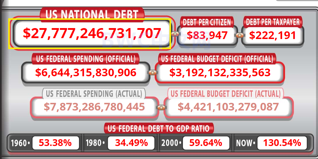 截至1月11日,美国联邦债务总额已高达27.8万亿美元,如下图。过去一年间,美国联邦债务总额增加了约4.5万亿美元。目前的债务总额已达到1958年美国刚有赤字时,只有2800亿美元债务的约100倍。