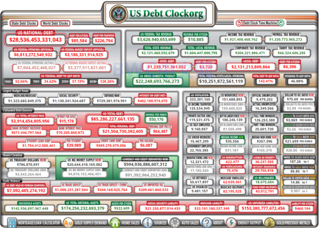 一战前,金本位制是至高无上的。而此后,随着凯恩斯主义经济学大行其道,特别是二战后,美国等西方经济体不断靠债务赤字堆积繁荣和福利,导致美元成了为美国经济轻松获得物质财富的工具。甚至尼克松在1971年单方面宣布将美元与黄金脱钩,这也成为滋生美国债务赤字推高的温床。如下图,这个像盘丝洞一样的美国债务时钟,时刻提醒着美国人,美国经济每一秒的运行都离不开债务。而截至7月19日,美国国家债务已经高达28.5万亿美元的新纪录。