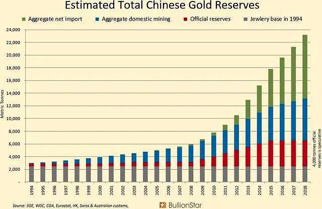据IMF披露的资料显示,如今中国持有的黄金储备达1948吨,相当于中国公布外储总量的3.3%,但在金属和矿产领域对中国经济战略行动的洞悉力有非同一般的Simon Hunt公司认为,中国市场在1982到2019年间囤积了2.5万吨黄金,加上近几年攒积5000吨,数量可能高达3万吨,并将其贮藏在不同的账户中。当然了,这其中并不包括大量在过去被购买、开采和民间储存的黄金,它们也从未被列入官方的黄金储备数据之列。