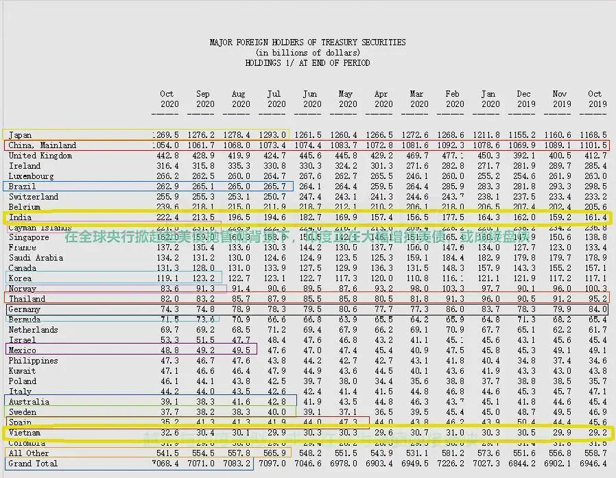 与此同时,还包括日本、德国、印度、俄罗斯、英国、法国、加拿大等29个美债持有者均不同程度地减持,比如,10月,日本也连续三个月减持,累计减235亿美元美债。