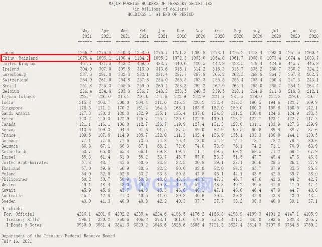 比如,据美国财政部在7月17日最新公布的国际资本流动报告显示,外国买家在2021年5月连续三个月净卖出美债934亿美元,同时,中国所持美债也连续第三个月再次减少177亿美元,在截止今年5月的24个月内,中国已经共净抛售1350亿美债,甚至,俄罗斯还在一周前正式在其国家财富基金中完全剥离了美元资产。