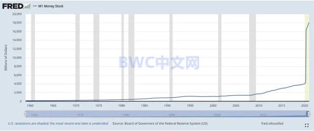 根据美联储在7月10日公布的最新编制的金融稳定性报告显示,美国金融体系的债务已经达到90万亿美元。BWC中文网财经团队一直在强调,美国未来肯定是高通胀时代,根源在于不断膨胀的债务率只能通过高通胀来化解,本质上就是进行债务货币化,或者说是货币重置,如您所见,在过去的60多周中,美国M1相较2020年3月时增长了71%以上,在此期间,美联储的资产负债表扩大了226%。