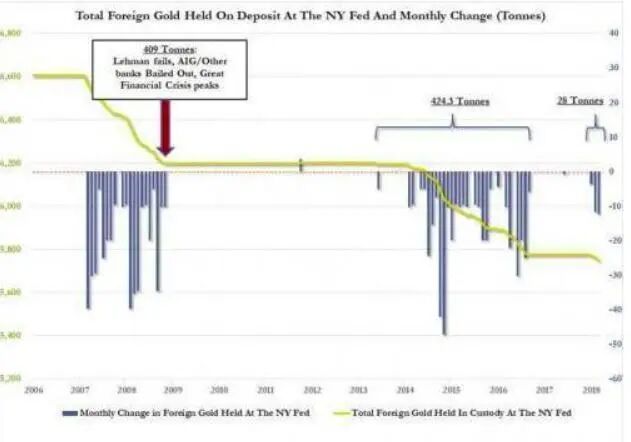 自上世纪四十年代中叶以来,在深20米的纽约联邦储蓄银行地下五层金库中,美联储替全世界约60多个国家和国际组织保管着约7000吨黄金。然而数据显示,如下图,美联储地下金库中的黄金存量目前已跌至历史最低点,总计约5750吨。也就是说,大约1250吨黄金已被运出美国。