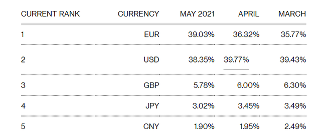 环球银行金融电信协会(SWIFT)最新数据显示,5月在全球支付货币占比中,美元已跌至38.35%,被欧元39.03%超越。也就是说,美元在全球经贸的流通地位已经被欧元替代了。雪上加霜的是,作为美元核心资产的美债也持续传来坏消息。