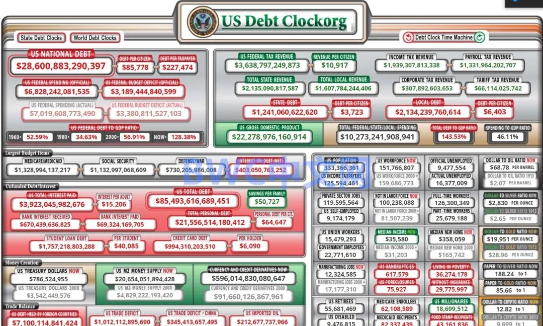 正如下图数据所示,在过去的60多周中,美国M2货币供应量一直在直线上升,超过自美联储自1913年成立以来的货币增长速度(下面的这根大直线完美地诠释了这个过程),目前,美国联邦债务总额已达到28.5万亿美元的新高。而美联储的资产负债总额已经高达创纪录的7.2万亿美元。此时美联储或已近乎于“弹尽粮绝”了。
