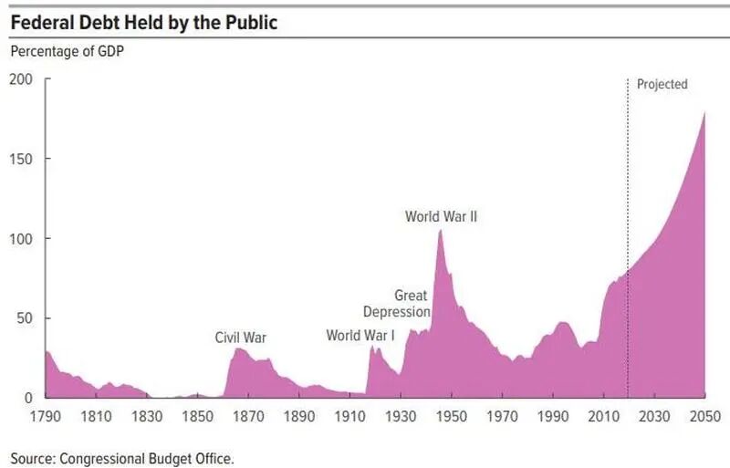根据美联储在8月2日公布的最新编制的金融稳定性报告显示,美国金融体系的债务赤字已经达到90.6万亿美元,正如下图所示,美国国会预算办公室预测美国债务与国内生产总值的前景并不那么美好。