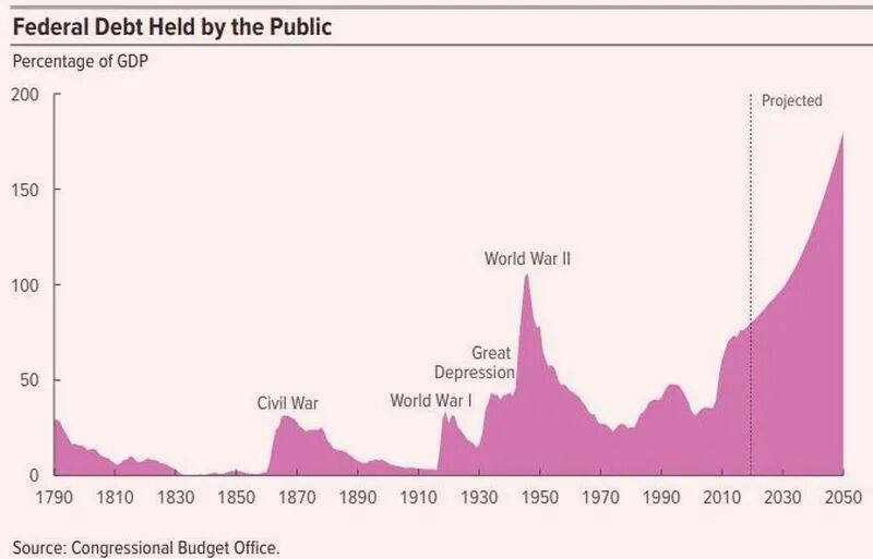 根据美联储在8月2日最新编制的金融稳定性报告显示,美国金融体系的债务已达到90.6万亿美元,正如下图表所示,美国国会预算办公室也预测美国债务与GDP的占比前景并不那么美好。