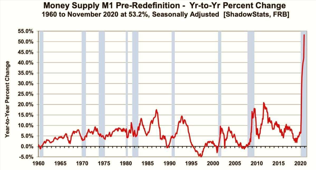 美联储主席鲍威尔在8月25日参加的一次活动中称,新冠疫情继续给美国经济活动蒙上阴影,美联储的货币政策工具有局限性,相比之下,美国财政和政府的政策比货币政策更加有力,这也意味着,美联储似乎已经无计可施,接近弹尽粮绝,但是,美国将这些庞大的数十万亿美元债务进行货币化的进程仍在加速,目前美联储每月购买的1200亿美元的基础资产,如果乘以美国货币基数的10倍,这就相当于每月增加1.2万亿美元的M1和M2,如您所见,美国M1在2021年又增长了58%以上。